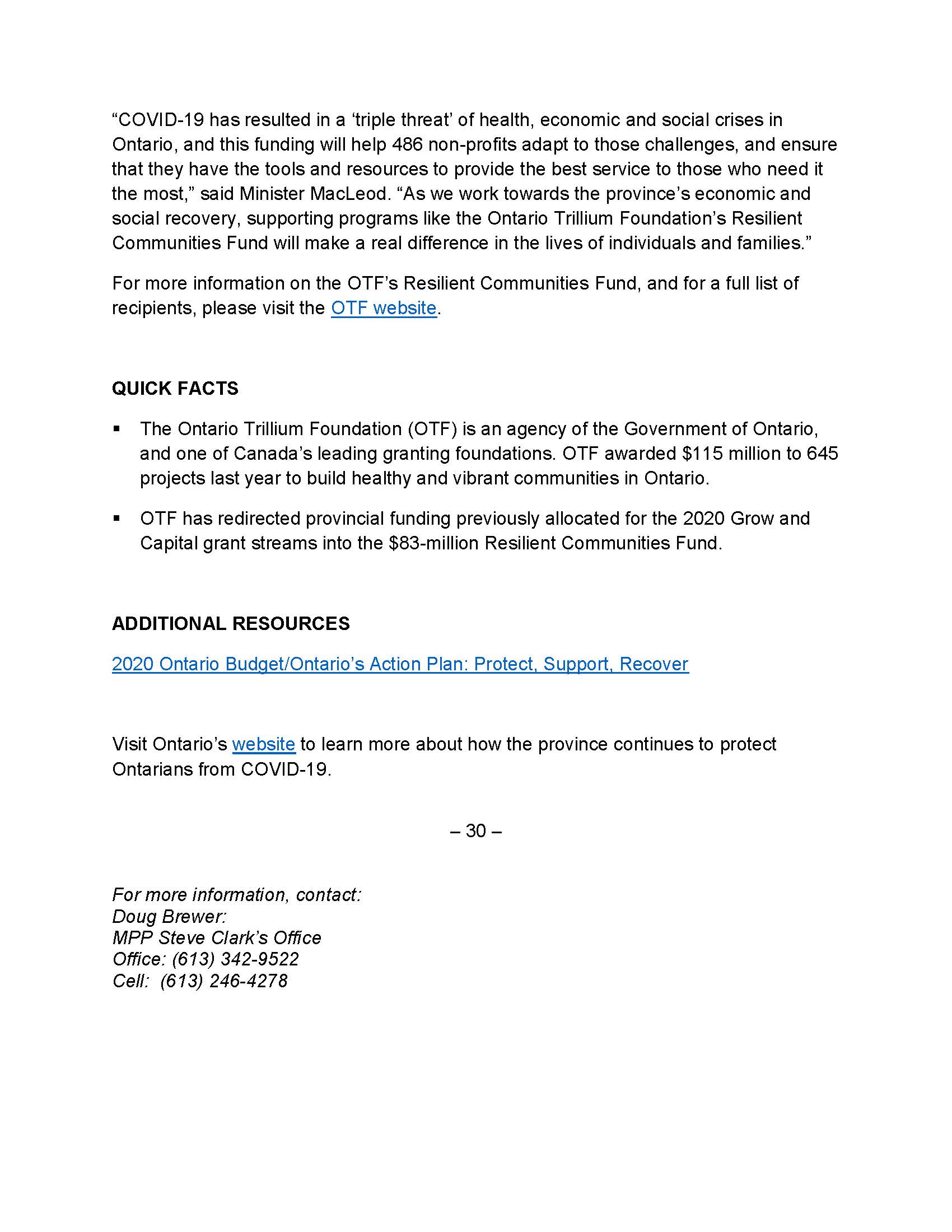 “COVID-19 has resulted in a ‘triple threat’ of health, economic and social crises in Ontario, and this funding will help 486 non-profits adapt to those challenges, and ensure that they have the tools and resources to provide the best service to those who need it the most,” said Lisa MacLeod, Minister of Heritage, Sport, Tourism and Culture Industries. “As we work towards the province’s economic and social recovery, supporting programs like the Ontario Trillium Foundation’s Resilient Communities Fund will make a real difference in the lives of individuals and families.”